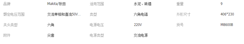 本网页所展示的有关【Makita牧田电锤电镐超大功率减震重型冲击钻装修凿墙钻墙M8600B_电动工具_东莞市得宝电动工具有限公司】的信息/图片/参数等由全球零部件网的会员【东莞市得宝电动工具有限公司】提供,由全球零部件网会员【东莞市得宝电动工具有限公司】自行对信息/图片/参数等的真实性、准确性和合法性负责,本平台(本网站)仅提供展示服务,请谨慎交易,因交易而产生的法律关系及法律纠纷由您自行协商解决,本平台(本网站)对此不承担任何责任。您在本网页可以浏览【Makita牧田电锤电镐超大功率减震重型冲击钻装修凿墙钻墙M8600B_电动工具_东莞市得宝电动工具有限公司】有关的信息/图片/价格等及提供【Makita牧田电锤电镐超大功率减震重型冲击钻装修凿墙钻墙M8600B_电动工具_东莞市得宝电动工具有限公司】的商家公司简介、联系方式等信息。