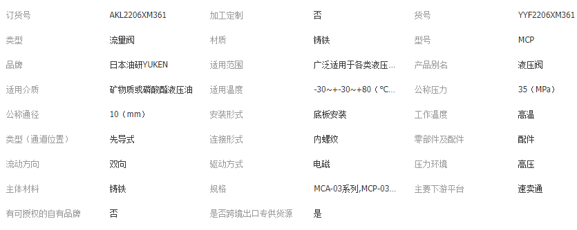 本网页所展示的有关【日本YUKEN油研 MCP/MCT/MCA/MCB-01/03-0/2-10/20/30叠加式 单向阀_电磁阀_厦门艾可勒自动化科技有限公司】的信息/图片/参数等由全球零部件网的会员【厦门艾可勒自动化科技有限公司】提供,由全球零部件网会员【厦门艾可勒自动化科技有限公司】自行对信息/图片/参数等的真实性、准确性和合法性负责,本平台(本网站)仅提供展示服务,请谨慎交易,因交易而产生的法律关系及法律纠纷由您自行协商解决,本平台(本网站)对此不承担任何责任。您在本网页可以浏览【日本YUKEN油研 MCP/MCT/MCA/MCB-01/03-0/2-10/20/30叠加式 单向阀_电磁阀_厦门艾可勒自动化科技有限公司】有关的信息/图片/价格等及提供【日本YUKEN油研 MCP/MCT/MCA/MCB-01/03-0/2-10/20/30叠加式 单向阀_电磁阀_厦门艾可勒自动化科技有限公司】的商家公司简介、联系方式等信息。