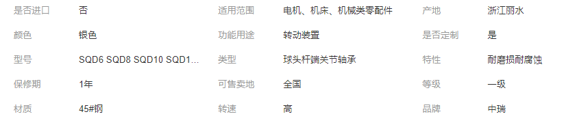 本网页所展示的有关【单杆关节轴承球头杆端 SQD6/SQD8/SQD10到SQD16非标定制_轴承_丽水中瑞轴承自动化有限公司】的信息/图片/参数等由全球零部件网的会员【丽水中瑞轴承自动化有限公司】提供,由全球零部件网会员【丽水中瑞轴承自动化有限公司】自行对信息/图片/参数等的真实性、准确性和合法性负责,本平台(本网站)仅提供展示服务,请谨慎交易,因交易而产生的法律关系及法律纠纷由您自行协商解决,本平台(本网站)对此不承担任何责任。您在本网页可以浏览【单杆关节轴承球头杆端 SQD6/SQD8/SQD10到SQD16非标定制_轴承_丽水中瑞轴承自动化有限公司】有关的信息/图片/价格等及提供【单杆关节轴承球头杆端 SQD6/SQD8/SQD10到SQD16非标定制_轴承_丽水中瑞轴承自动化有限公司】的商家公司简介、联系方式等信息。
