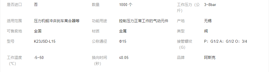 本网页所展示的有关【二位三通离合器双联安全阀断电自动保护K23JSD-L15电控_安全阀_阿斯克机械(无锡)有限公司】的信息/图片/参数等由全球零部件网的会员【阿斯克机械(无锡)有限公司】提供,由全球零部件网会员【阿斯克机械(无锡)有限公司】自行对信息/图片/参数等的真实性、准确性和合法性负责,本平台(本网站)仅提供展示服务,请谨慎交易,因交易而产生的法律关系及法律纠纷由您自行协商解决,本平台(本网站)对此不承担任何责任。您在本网页可以浏览【二位三通离合器双联安全阀断电自动保护K23JSD-L15电控_安全阀_阿斯克机械(无锡)有限公司】有关的信息/图片/价格等及提供【二位三通离合器双联安全阀断电自动保护K23JSD-L15电控_安全阀_阿斯克机械(无锡)有限公司】的商家公司简介、联系方式等信息。