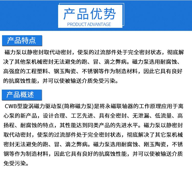 产品涵盖磁力泵、隔膜泵、化工泵、离心泵、排污泵、螺杆泵、自吸泵、管道泵等系列。浙江汉洲泵业科技产品素以工艺精湛、性能稳定可靠、质量优良享誉国内外市场,在石油、化工、电力、市政、水利、建筑、环保、冶金、食品、医药等行业树立了良好的口碑和品牌知名度。