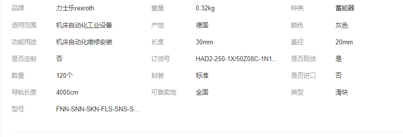 本网页所展示的有关【成型机械液压系统REXROTH蓄能器 HAD2-250-1X/50Z08C-1N111-CE_五金配件_天津福业动力机械科技发展有限公司】的信息/图片/参数等由全球零部件网的会员【天津福业动力机械科技发展有限公司】提供,由全球零部件网会员【天津福业动力机械科技发展有限公司】自行对信息/图片/参数等的真实性、准确性和合法性负责,本平台(本网站)仅提供展示服务,请谨慎交易,因交易而产生的法律关系及法律纠纷由您自行协商解决,本平台(本网站)对此不承担任何责任。您在本网页可以浏览【成型机械液压系统REXROTH蓄能器 HAD2-250-1X/50Z08C-1N111-CE_五金配件_天津福业动力机械科技发展有限公司】有关的信息/图片/价格等及提供【成型机械液压系统REXROTH蓄能器 HAD2-250-1X/50Z08C-1N111-CE_五金配件_天津福业动力机械科技发展有限公司】的商家公司简介、联系方式等信息。