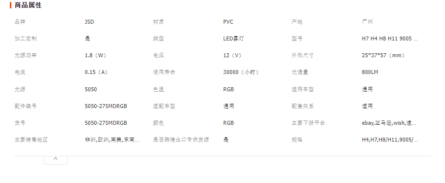 产品名称:H1 H3 H4 9005 9006 H7 H8/H11 880 881 27LED遥控七彩雾灯RGB倒车灯5050 一对装