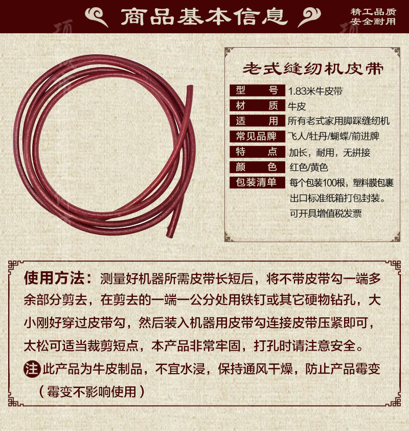 本网页所展示的有关【老式缝纫机配件 老式家用缝纫机皮带 脚踏家用缝纫机皮带 牛皮带_工程配件_项城市恒鑫皮件有限公司】的信息/图片/参数等由全球零部件网的会员【项城市恒鑫皮件有限公司】提供,由全球零部件网会员【项城市恒鑫皮件有限公司】自行对信息/图片/参数等的真实性、准确性和合法性负责,本平台(本网站)仅提供展示服务,请谨慎交易,因交易而产生的法律关系及法律纠纷由您自行协商解决,本平台(本网站)对此不承担任何责任。您在本网页可以浏览【老式缝纫机配件 老式家用缝纫机皮带 脚踏家用缝纫机皮带 牛皮带_工程配件_项城市恒鑫皮件有限公司】有关的信息/图片/价格等及提供【老式缝纫机配件 老式家用缝纫机皮带 脚踏家用缝纫机皮带 牛皮带_工程配件_项城市恒鑫皮件有限公司】的商家公司简介、联系方式等信息。
