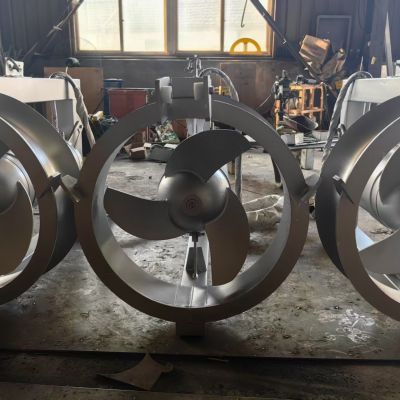 螺旋桨叶轮能够处理常规污水。螺旋桨叶轮在结构设计上是水力平衡的无缠绕和自清洁形式。螺旋桨叶轮精心地进行加工和表面处理,能高效率传递电机输出功率。叶轮有三叶片。所有叶片都是相同的形式,间隔距离均匀的。叶片与轮觳使用不锈钢AISI316或SU304。螺旋桨叶轮采用单键栓固定在轴的端部,采用保护帽进行密封,并使用锁定垫圈系统。螺旋桨叶轮经动平衡检验合格。