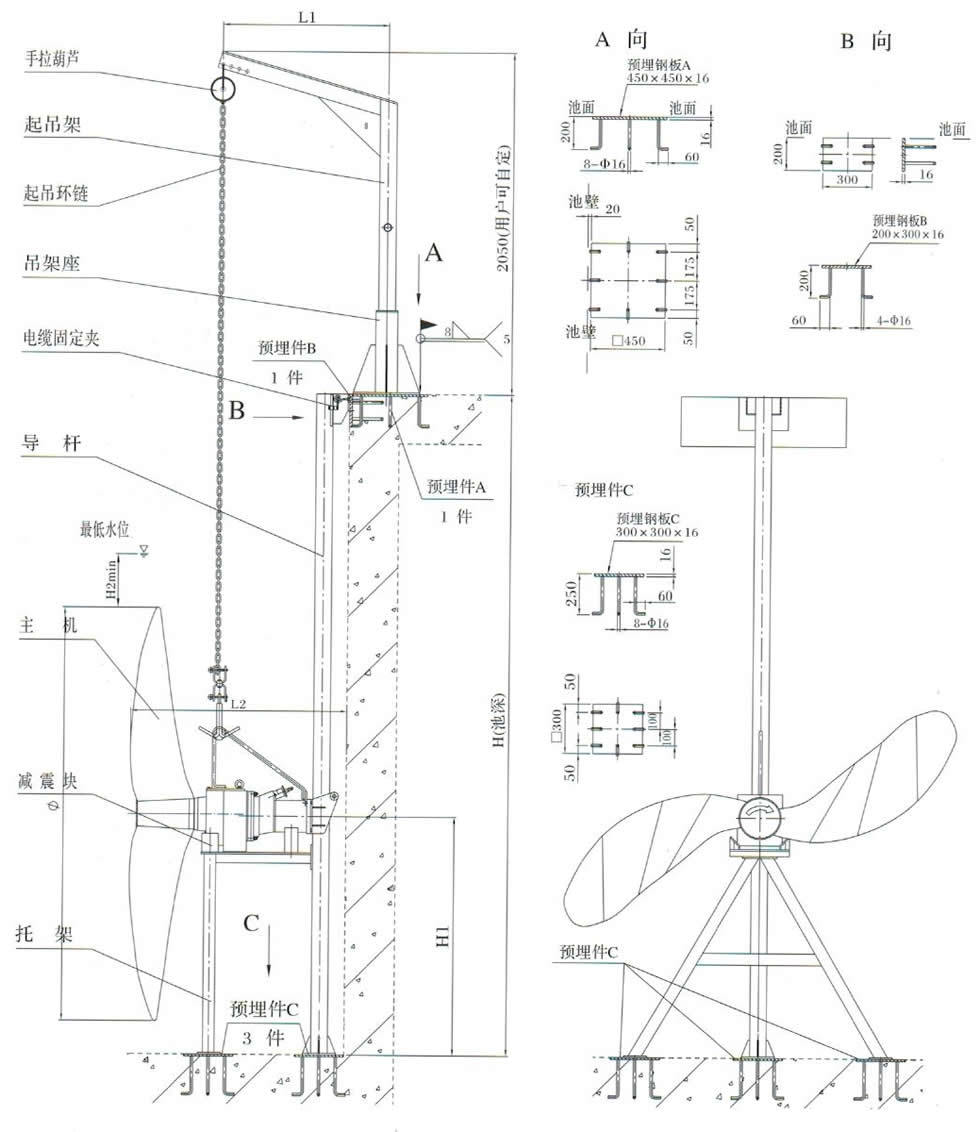 2、填料专用潜水推流器在整个运行过程中保持无振动平稳运行,运行时间至少为20000小时。